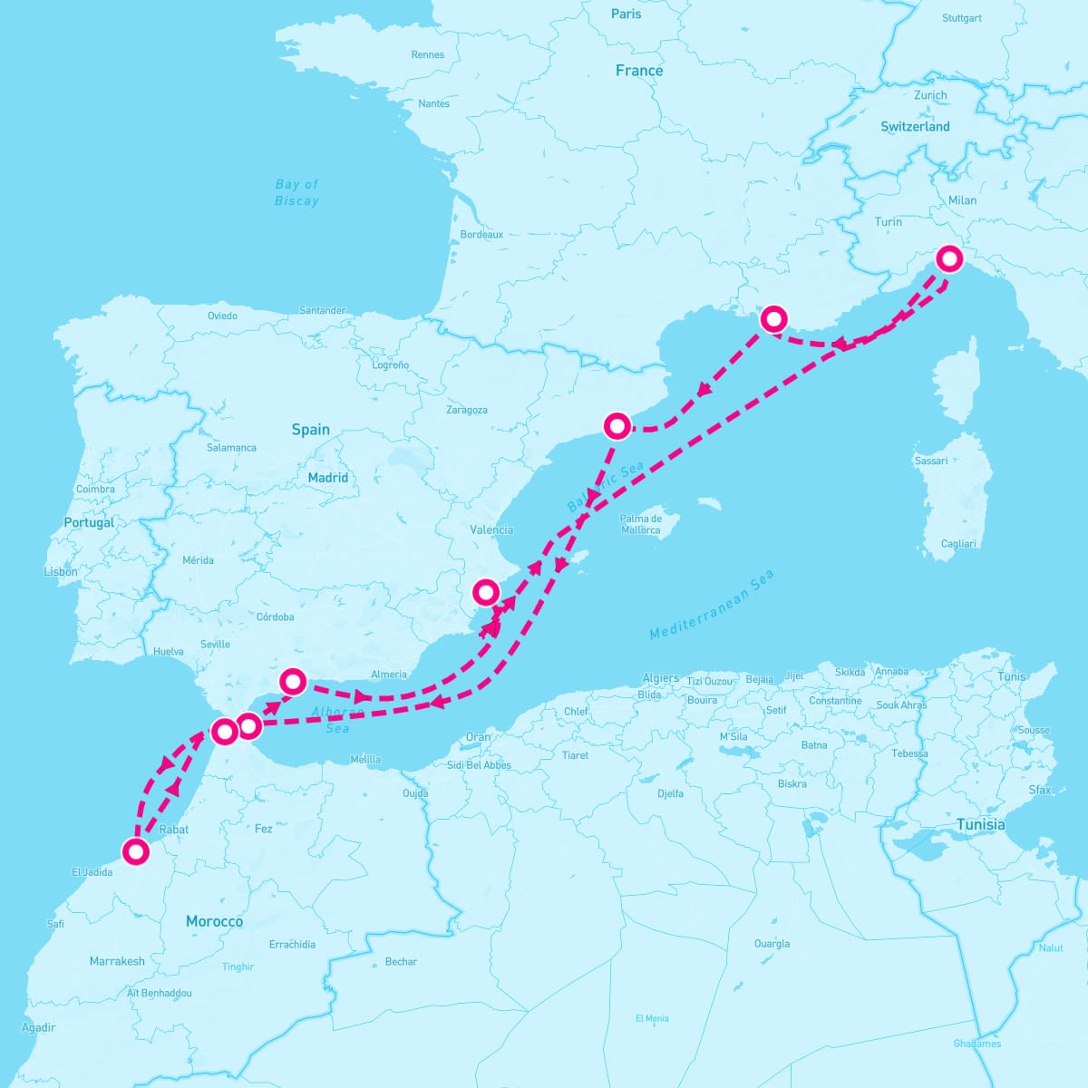 This route includes barcelona-spain, tangier-morocco, casablanca-morocco, ceuta-spanish-morocco-north-africa, malaga-spain, alicante-spain, genoa-italy, marseille-france.