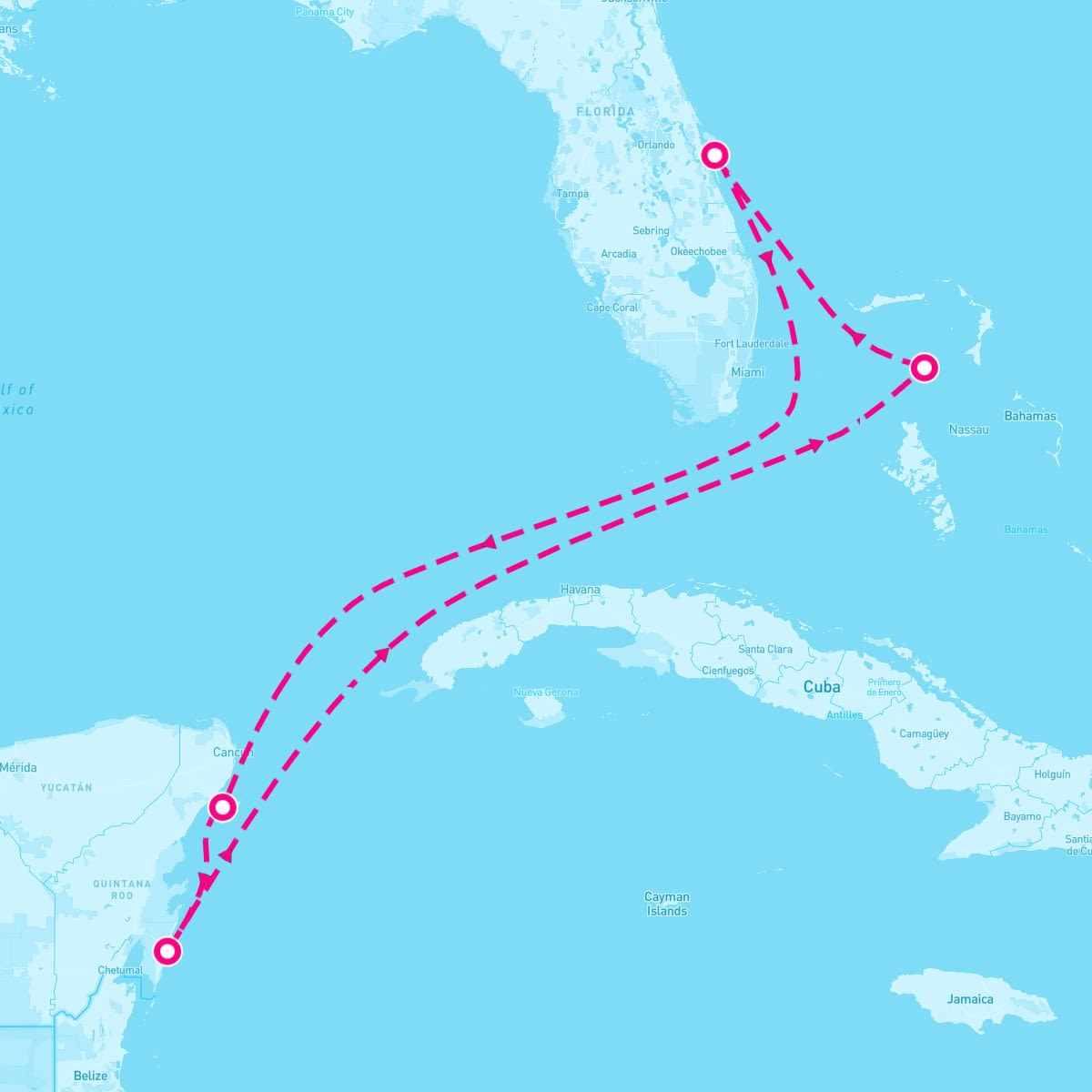 This route includes port-canaveral-florida, cozumel-mexico, costa-maya-mexico, great-stirrup-cay-cruiseline-private-island-bahamas.