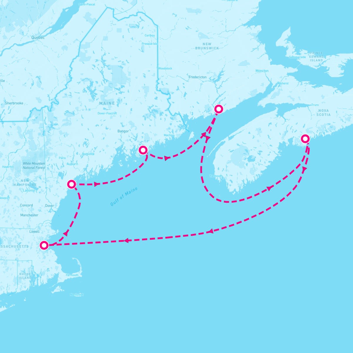This route includes boston-massachusetts, portland-maine, bar-harbor-maine, st-john-new-brunswick, halifax-nova-scotia.