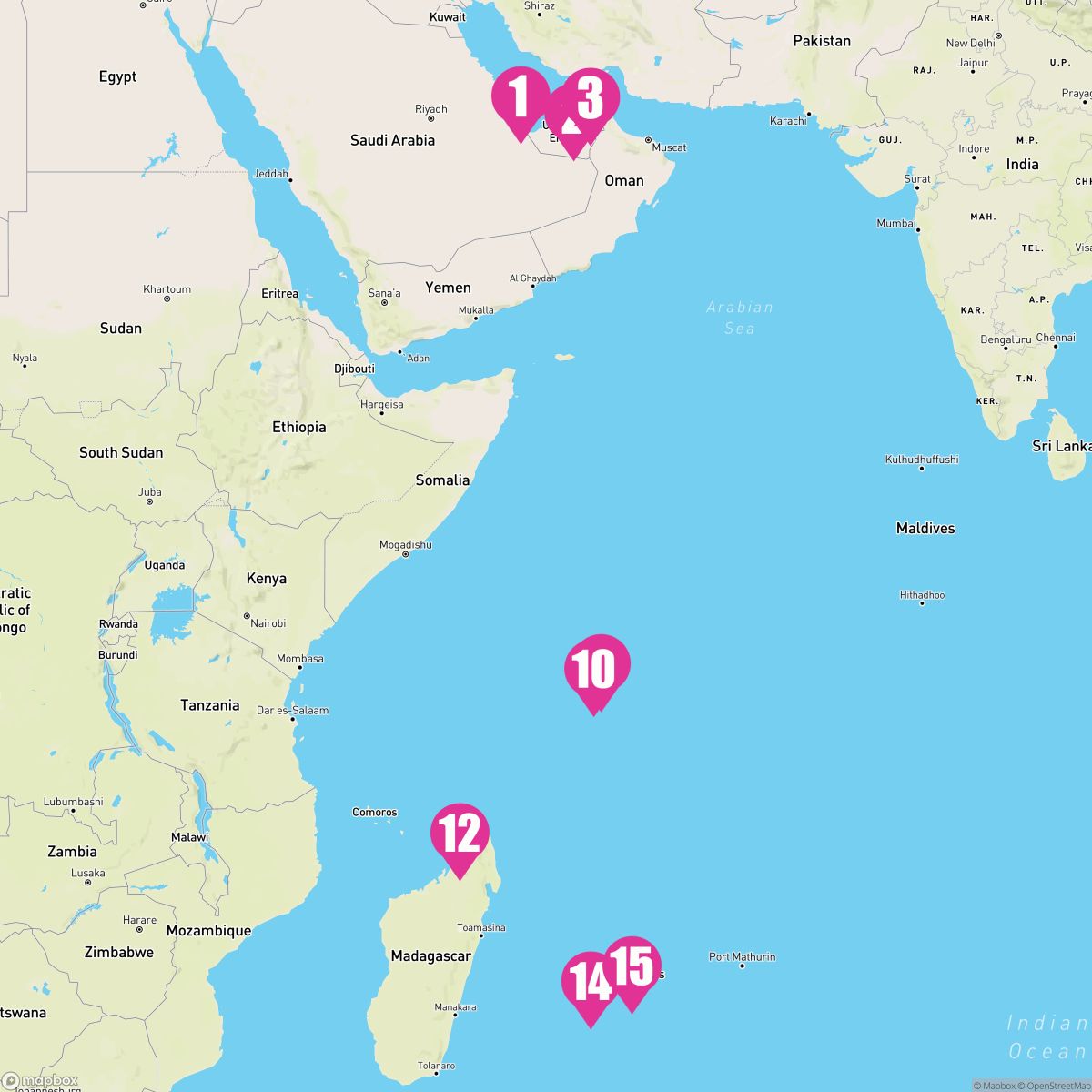The Norwegian Dawn sails on December 22, 2024 for a 14 Night South Africa: Seychelles Madagascar Oman & Uae (Doha To Port Louis). The ship will depart the port of Doha, Qatar at 7:00 PM and will return to the port of Port Louis, Mauritius on Jan 5th at 6:00 AM. During the 15-day journey, the Norwegian Dawn will visit 7 additional ports and will spend 6 days at sea.