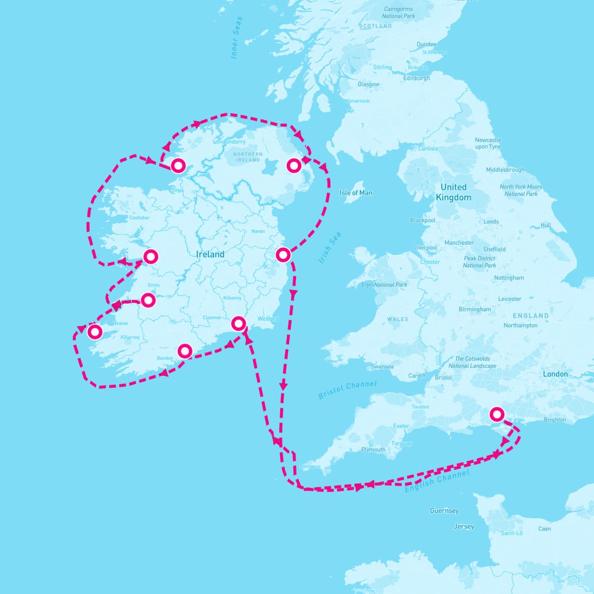This route includes southampton-england, waterford-ireland, cobh-cork-ireland, dingle-ireland, foynes-ireland, galway-ireland, killybegs-ireland, belfast-ireland, dun-laoghaire-dublin-ireland.