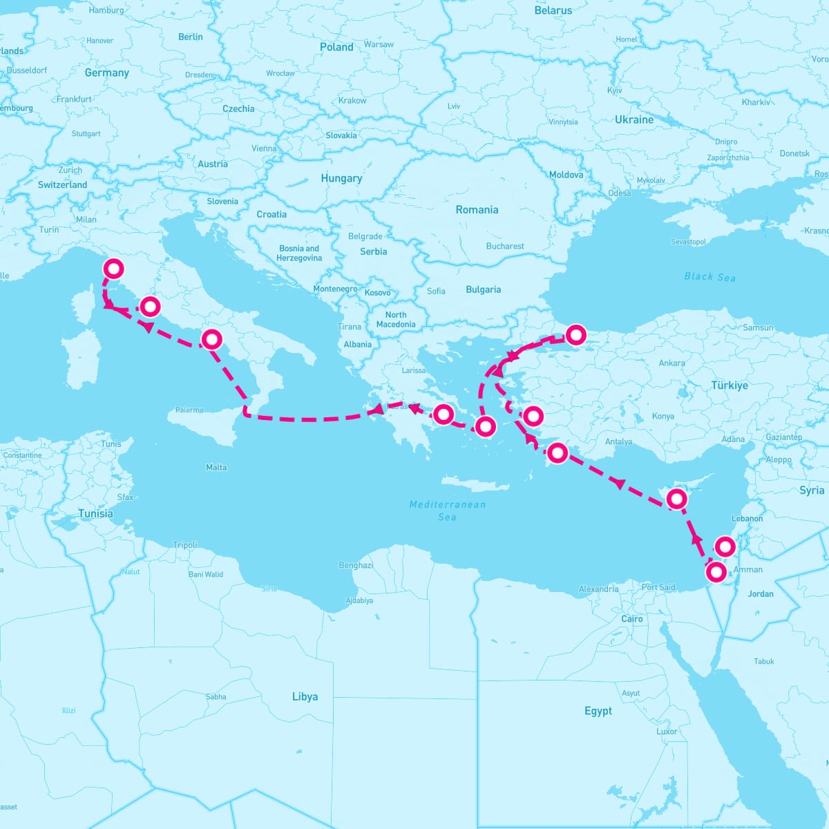 This route includes haifa-jerusalem-israel, ashdod-israel, limassol-cyprus, rhodes-greece, kusadasi-turkey, istanbul-turkey, mykonos-greece, athens-greece, naples-italy, livorno-florence-italy, rome-italy.