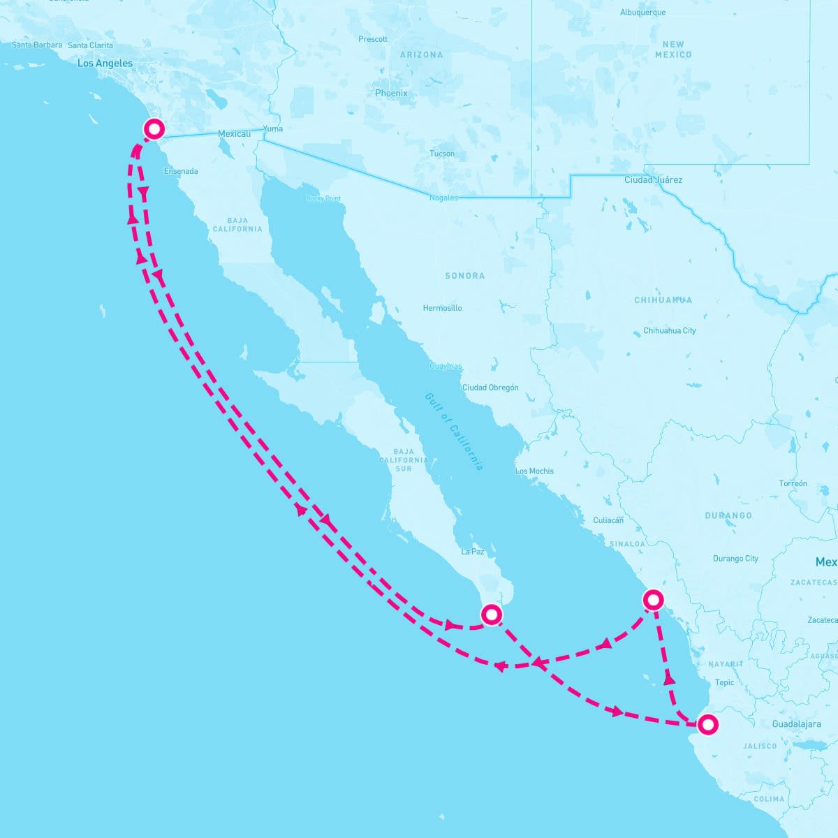 This route includes san-diego-california, cabo-san-lucas-mexico, puerto-vallarta-mexico, mazatlan-mexico.