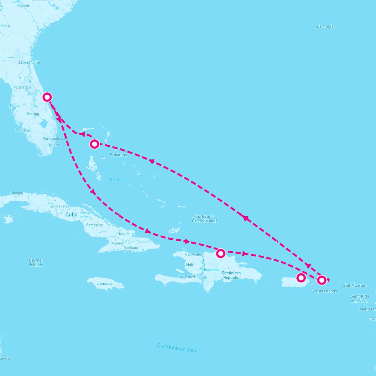 This route includes port-canaveral-florida, puerto-plata-dominican-republic, san-juan-puerto-rico, charlotte-amalie-st-thomas, great-stirrup-cay-cruiseline-private-island-bahamas.