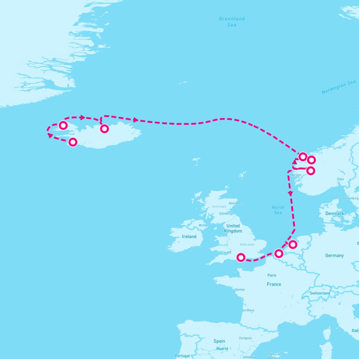 This route includes reykjavik-iceland, isafjordur-iceland, akureyri-iceland, alesund-norway, geiranger-norway, flaam-norway, amsterdam-netherlands, bruges-belgium, southampton-england.