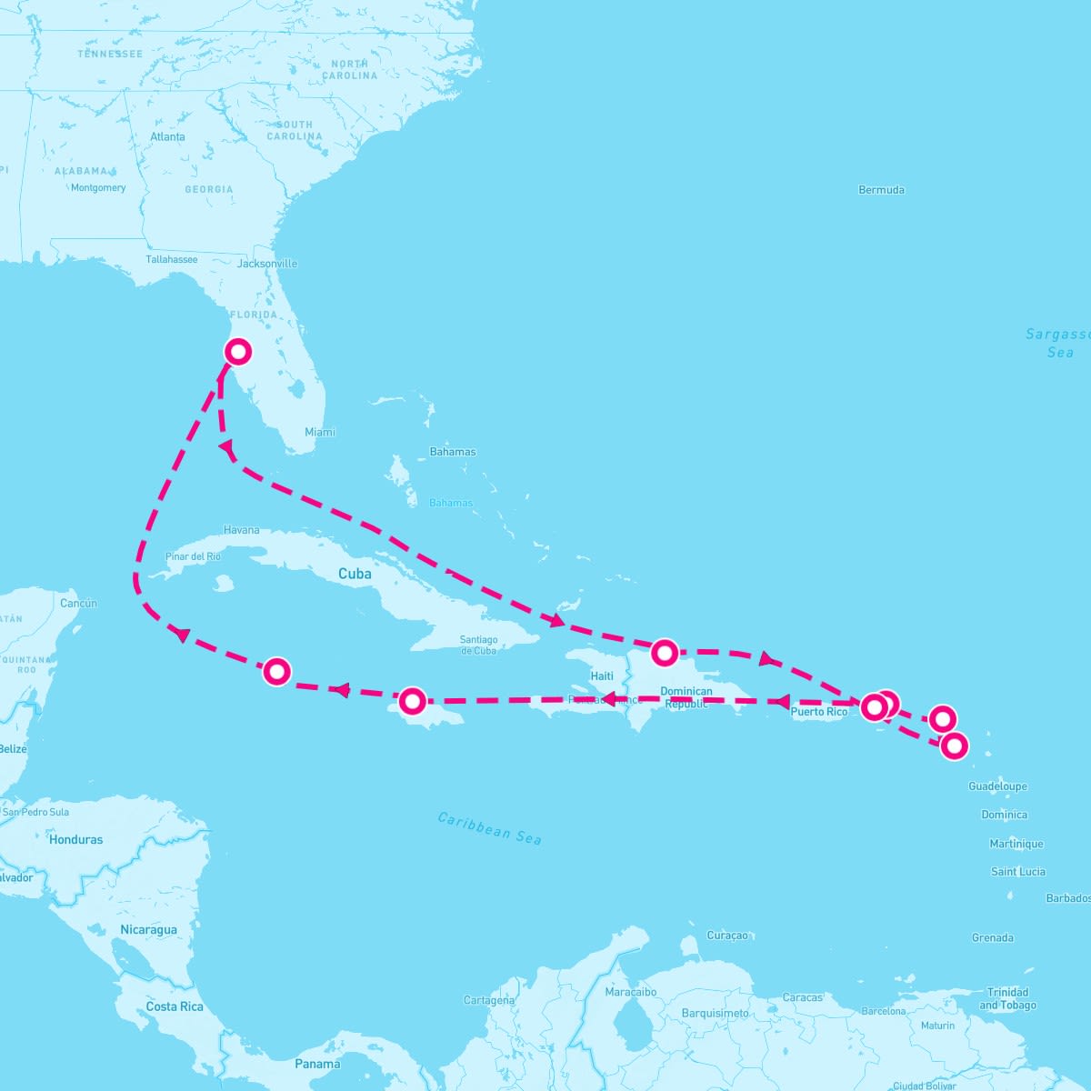 This route includes tampa-florida, puerto-plata-dominican-republic, charlotte-amalie-st-thomas, basseterre-st-kitts, philipsburg-st-maarten, tortola-british-virgin-islands, falmouth-jamaica, george-town-grand-cayman.