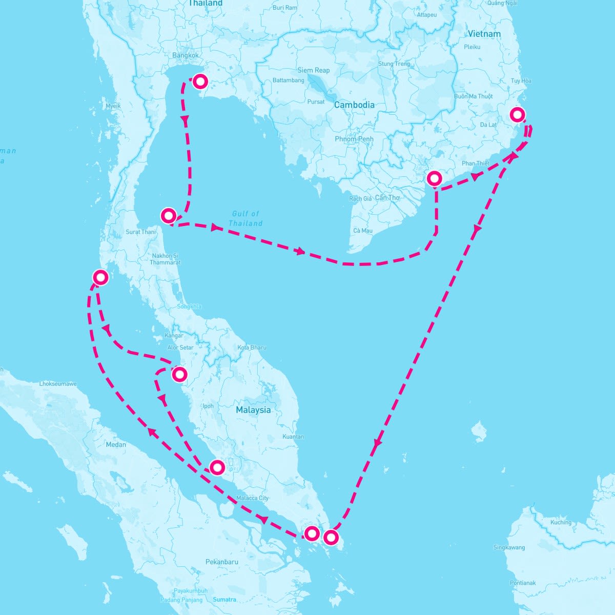 This route includes laem-chabang-bangkok-thailand, ko-samui-thailand, ho-chi-minh-vietnam, nha-trang-vietnam, pulau-bintan-indonesia, singapore, phuket-thailand, pulau-malaysia, kuala-lumpur-malaysia.