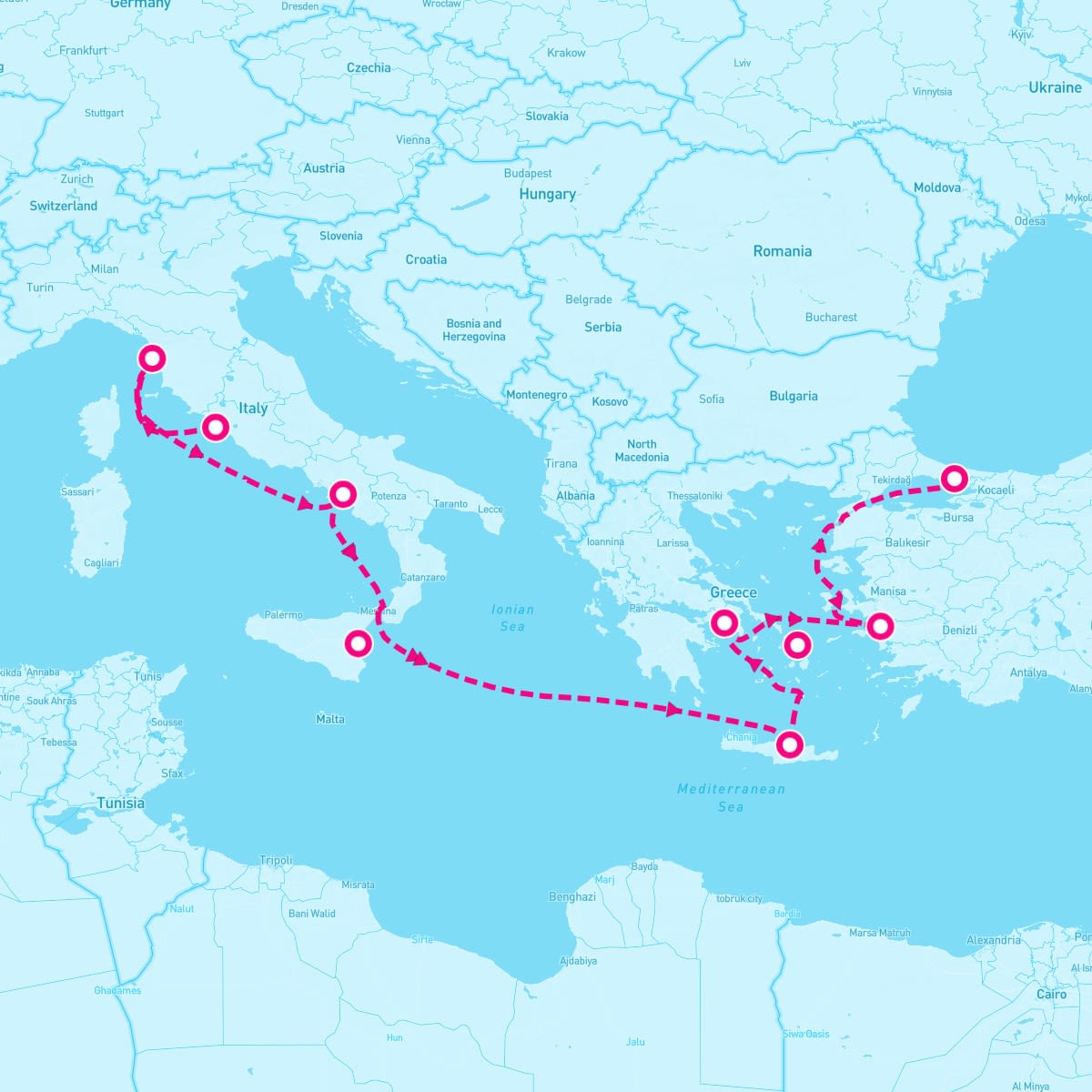 This route includes rome-italy, livorno-florence-italy, salerno-naples-italy, catania-sicily, heraklion-crete-greece, mykonos-greece, athens-greece, kusadasi-turkey, istanbul-turkey.