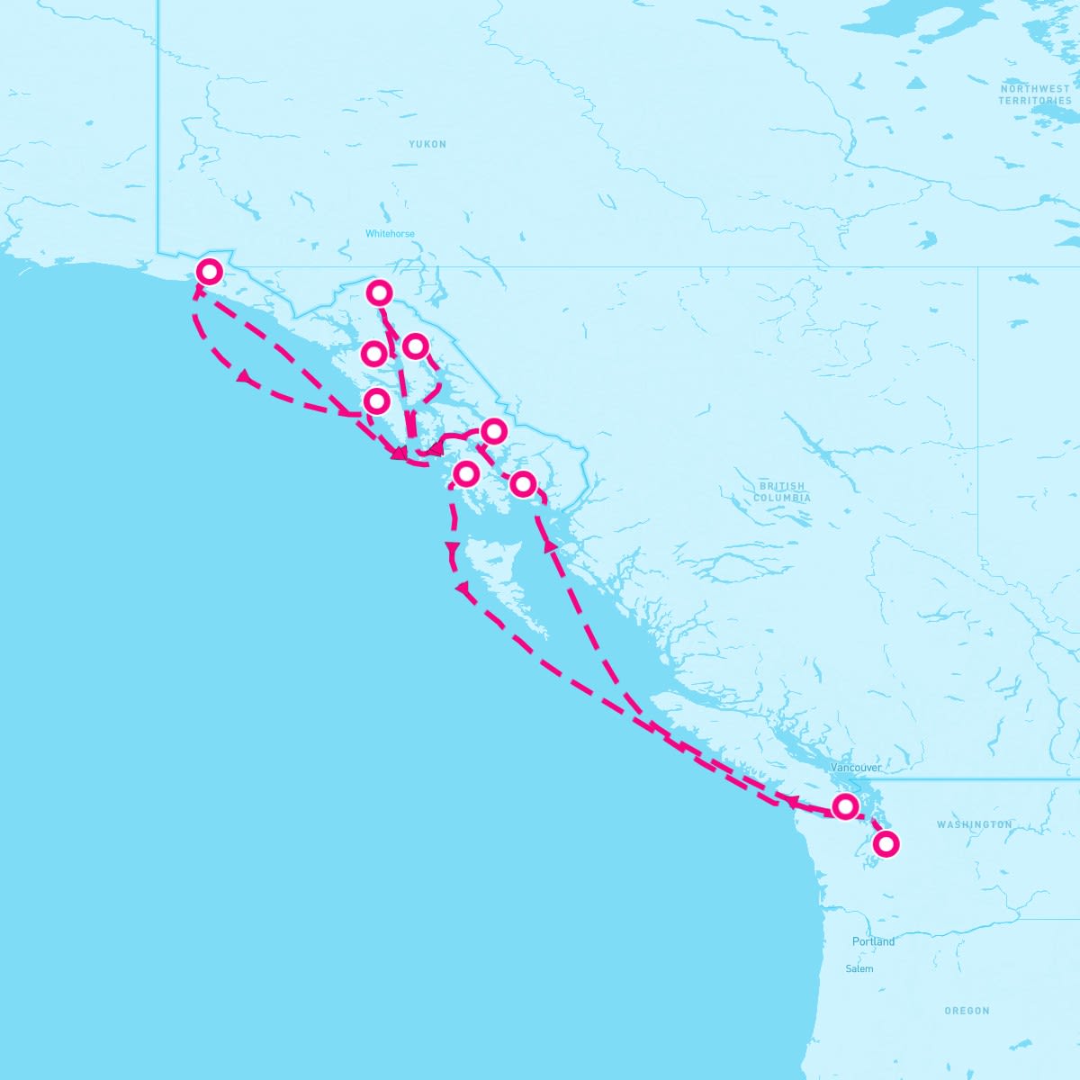 This route includes seattle-washington, ketchikan-alaska, juneau-alaska, skagway-alaska, icy-strait-point-alaska, cruise-hubbard-glacier, sitka-alaska, wrangell-alaska, klawock-alaska, victoria-british-columbia.