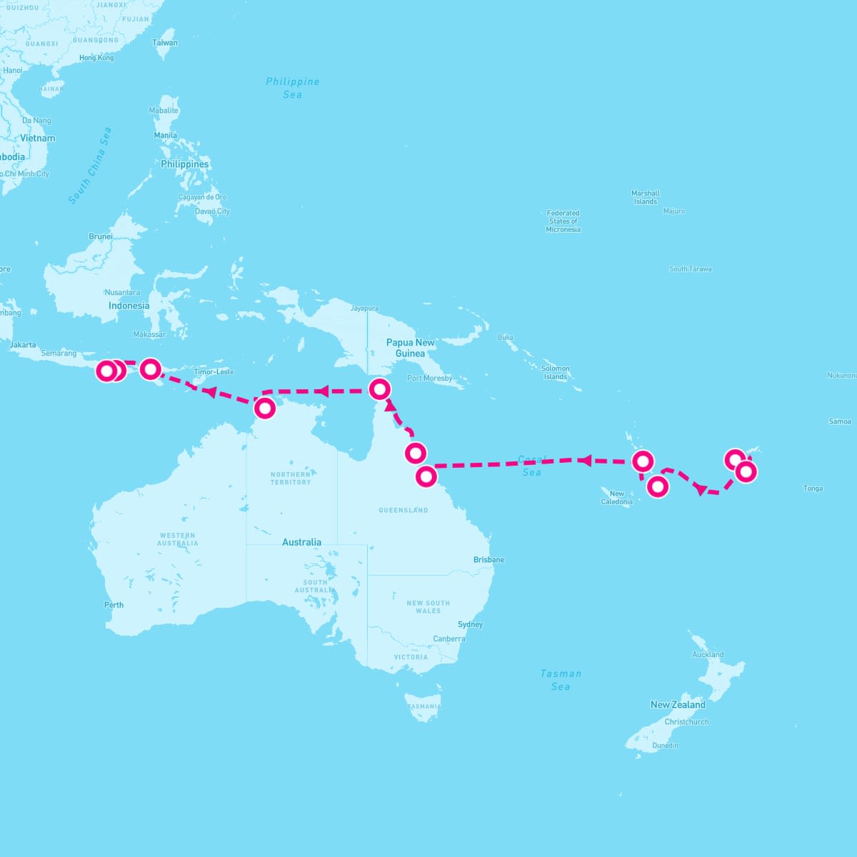 This route includes lautoka-fiji-islands, dravuni-island-fiji, mystery-island-vanuatu, port-vila-efate-vanuatu, townsville-australia, cairns-australia, thursday-island-australia, darwin-australia, komodo-island-indonesia, lembar-lombok-indonesia, benoa-bali-indonesia.