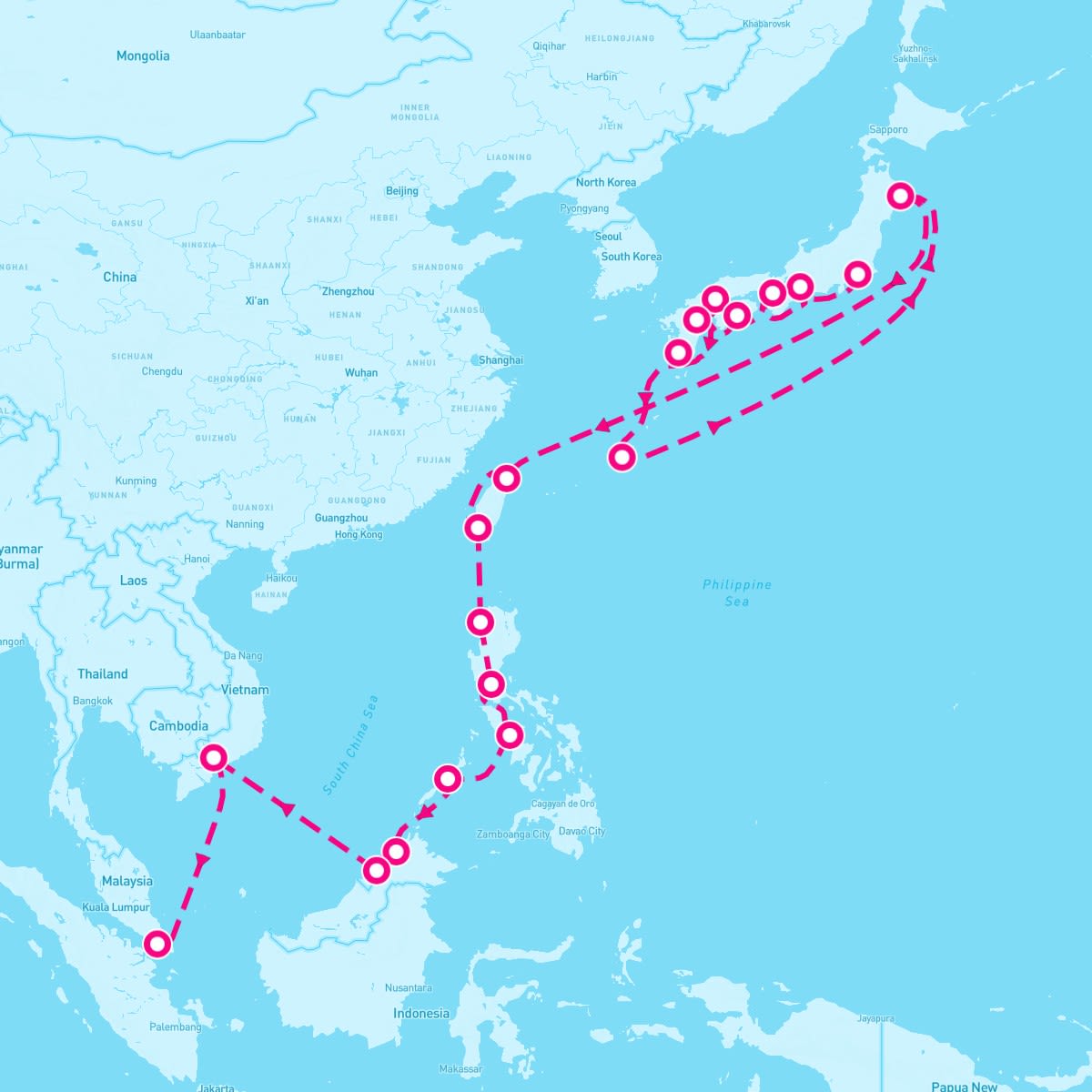 The Sirena sails on April 28, 2026 for a 26 Night Silk & Samurai Routes (Tokyo To Singapore). The ship will depart the port of Tokyo, Japan at 4:00 PM and will return to the port of Singapore on May 24th at 8:00 AM. During the 27-day journey, the Sirena will visit 18 additional ports and will spend 5 days at sea.