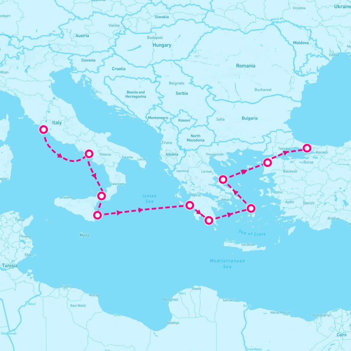 The Sirena sails on May 24, 2027 for a 9 Night Mysteries Of History (Rome To Istanbul). The ship will depart the port of Civitavecchia (Rome), Italy at 5:00 PM and will return to the port of Istanbul, Turkey on Jun 2nd at 8:00 AM. During the 10-day journey, the Sirena will visit 9 additional ports and will spend 0 days at sea.