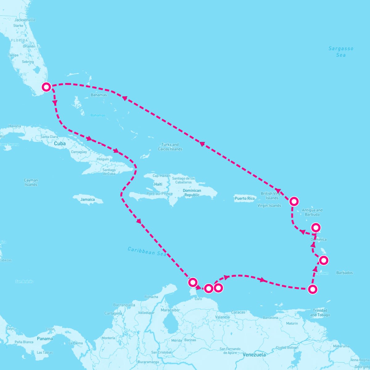 The November 28, 2027 cruise on the Sirena departs from Miami, Florida. On this 12 Night Caribbean Carousel (Miami Roundtrip) sailing, the ship will visit a total of 8 cruise port destinations, including its departure port. The Sirena sets sail on Sunday, Nov 28th and returns on Friday, Dec 10th.