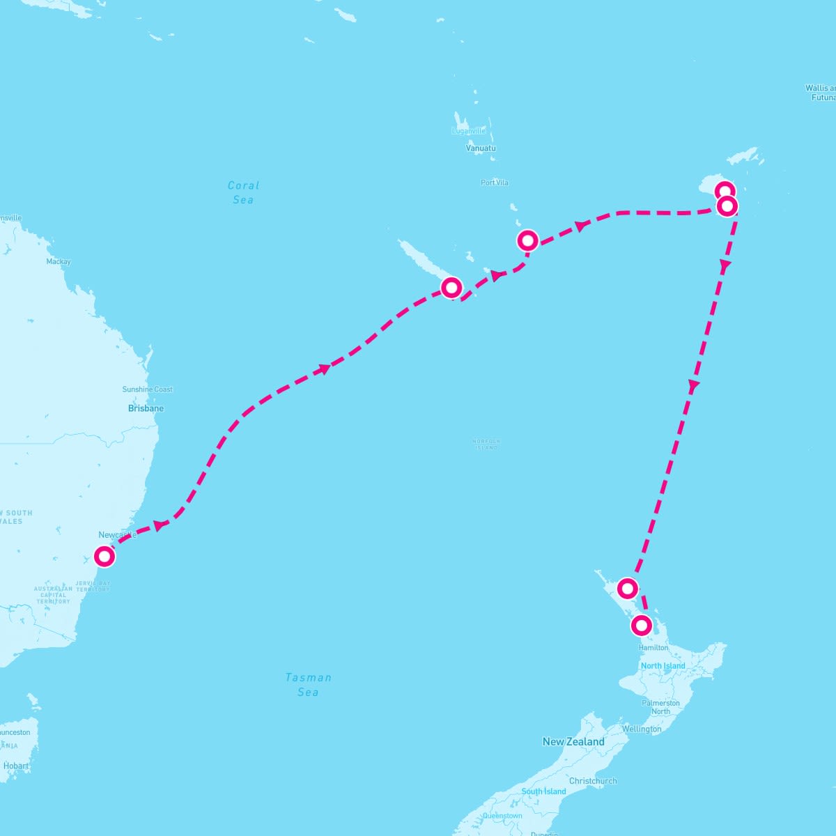 This route includes sydney-australia, noumea-new-caledonia, mystery-island-vanuatu, suva-fiji, dravuni-island-fiji, bay-of-islands-new-zealand, auckland-new-zealand.