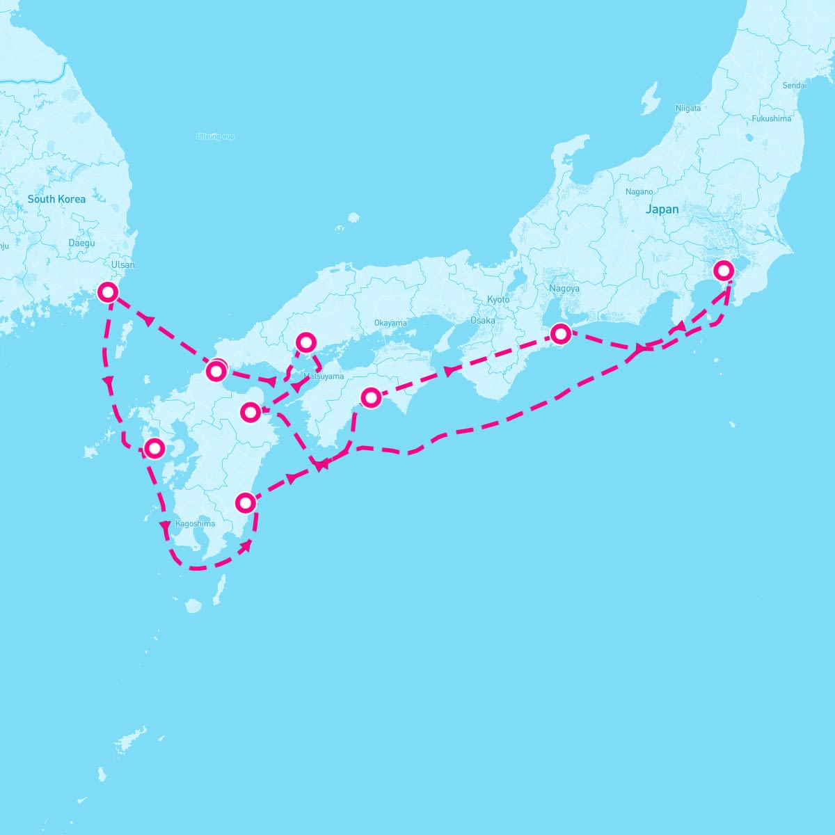This route includes yokohama-tokyo-japan, beppu-japan, hiroshima-japan, shimonoseki-japan, cruise-kanmon-straits-japan, busan-south-korea, nagasaki-japan, miyazaki-japan, kochi-japan, toba-japan.