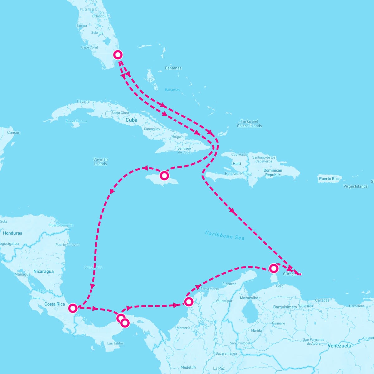 This route includes fort-lauderdale-florida, oranjestad-aruba, cartagena-colombia, colon-panama, panama-canal-cruise-into-canal, puerto-limon-costa-rica, ocho-rios-jamaica.