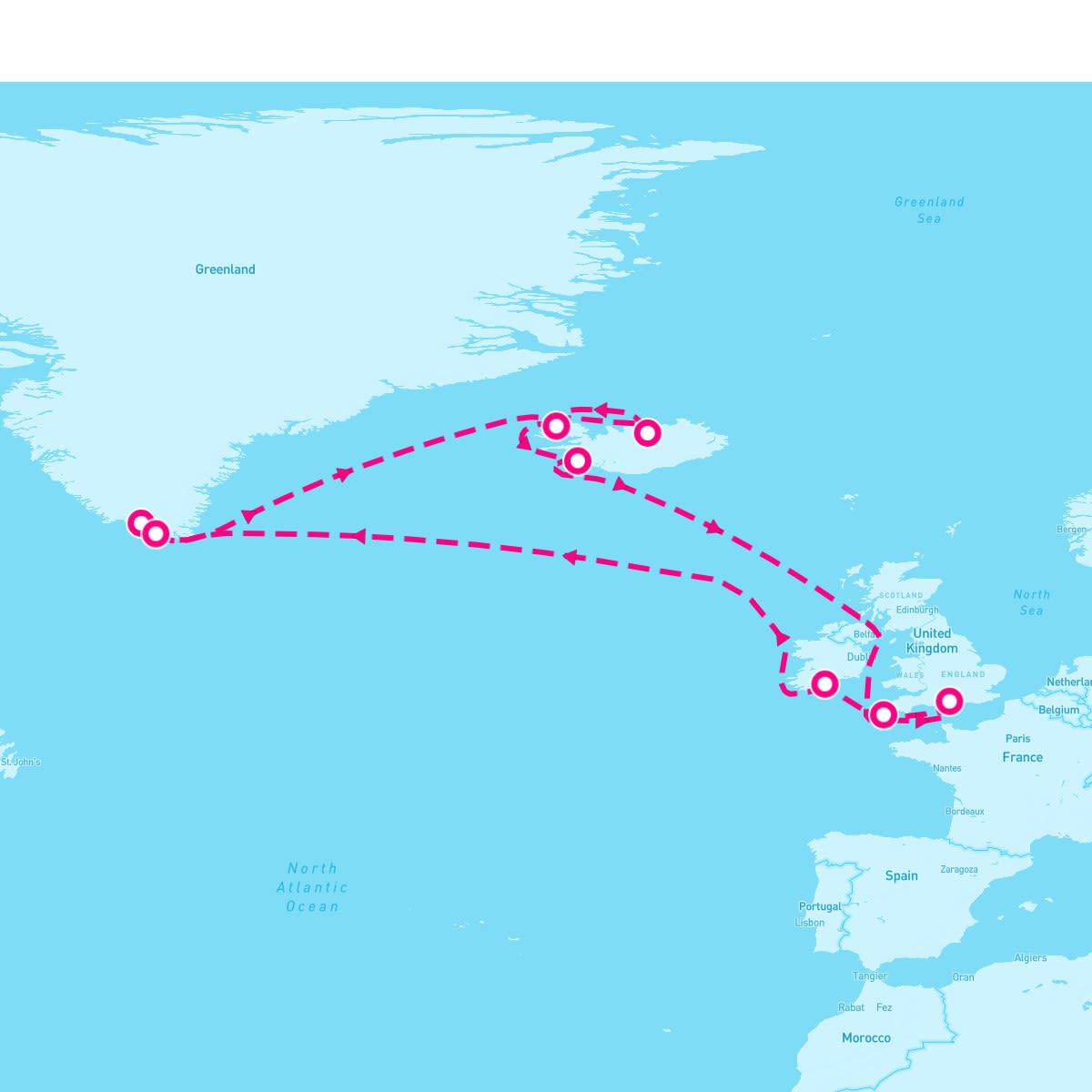 This route includes southampton-england, falmouth-cornwall-england, cobh-cork-ireland, qaqortoq-greenland, nanortalik-greenland, akureyri-iceland, isafjordur-iceland, reykjavik-iceland.