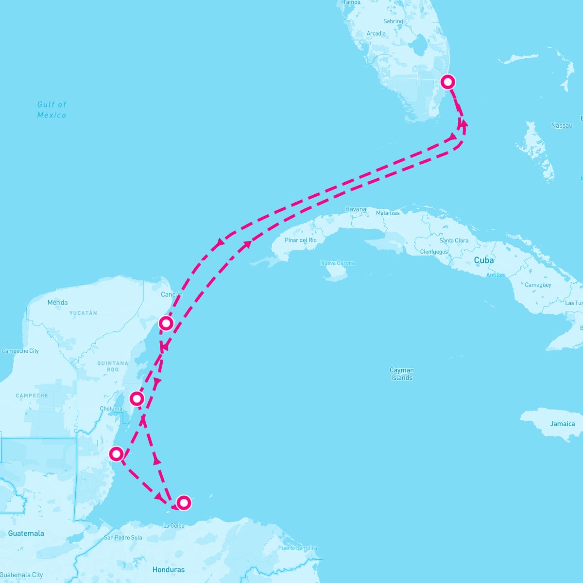 This route includes fort-lauderdale-florida, cozumel-mexico, belize-city-belize, roatan-bay-honduras, costa-maya-mexico.