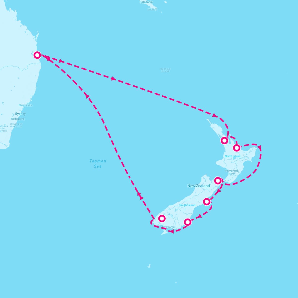 This route includes brisbane-australia, auckland-new-zealand, tauranga-new-zealand, picton-new-zealand, lyttleton-christchurch-new-zealand, dunedin-new-zealand, cruise-fjordland-national-park.