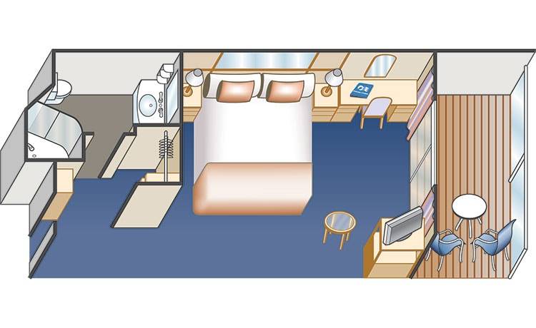 Cabin B744 includes: Balcony with 2 chairs and table, Floor-to-ceiling sliding glass doors, Comfortable queen or two twin beds, Refrigerator, Flat-panel television, Private bathroom with shower, 100% cotton and high-thread count linens, 24-hour room service, Spacious closet, Desk with chair, Hair dryer & bathroom amenities, Digital security safe.