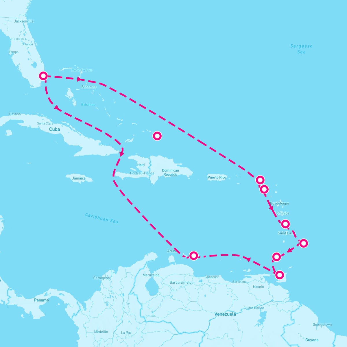 This route includes fort-lauderdale-florida, philipsburg-st-maarten, basseterre-st-kitts, fort-de-france-martinique, bridgetown-barbados, st-georges-grenada, port-of-spain, kralendijk-bonaire, grand-turk-turks-caicos.