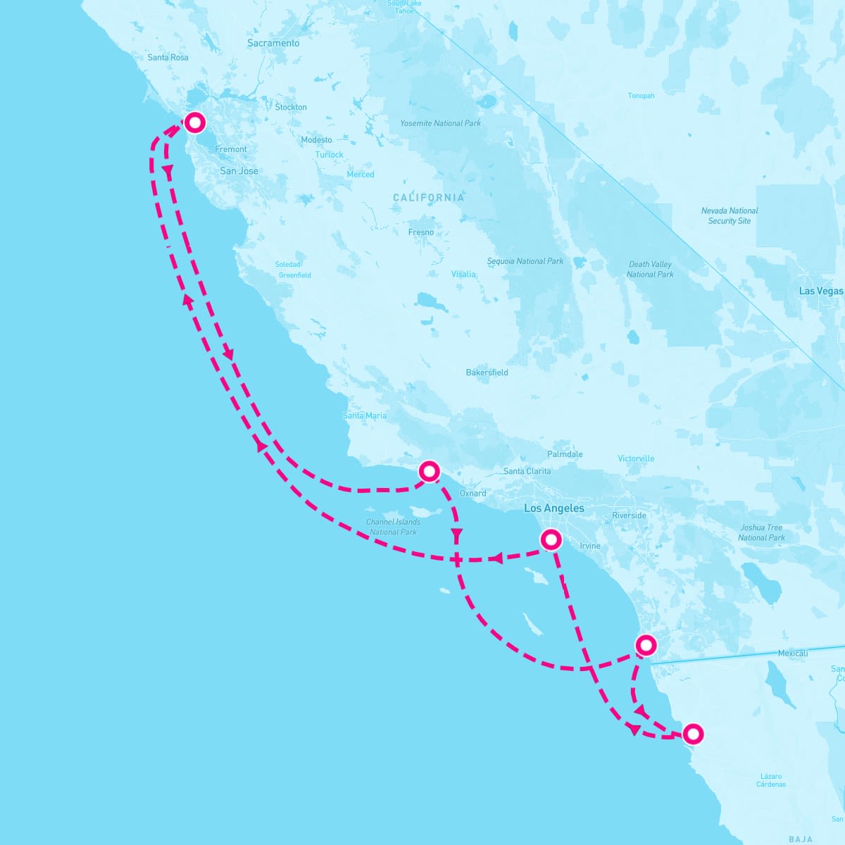 This route includes san-pedro-los-angeles-california, san-francisco-california, santa-barbara-california, san-diego-california, ensenada-mexico.