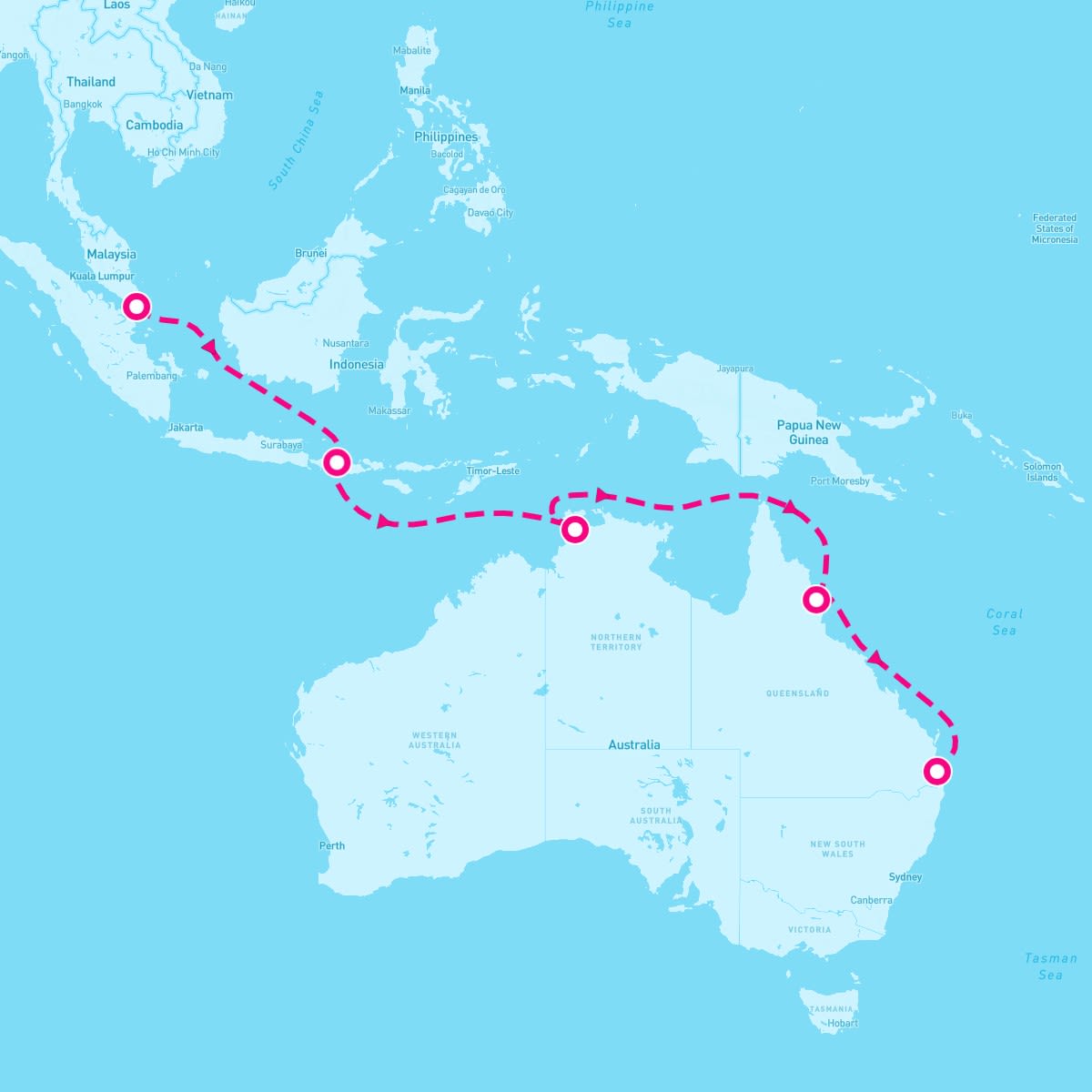 This route includes singapore, lombok-island-indonesia, darwin-australia, yorkey-s-knob-cairns-australia, brisbane-australia.