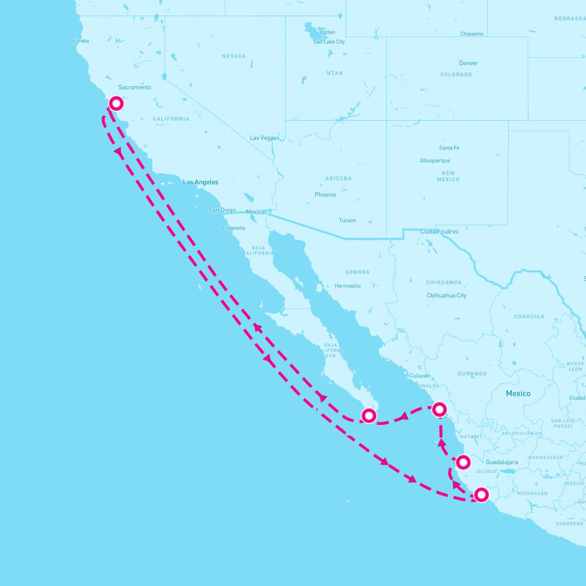This route includes san-francisco-california, manzanillo-mexico, puerto-vallarta-mexico, mazatlan-mexico, cabo-san-lucas-mexico.