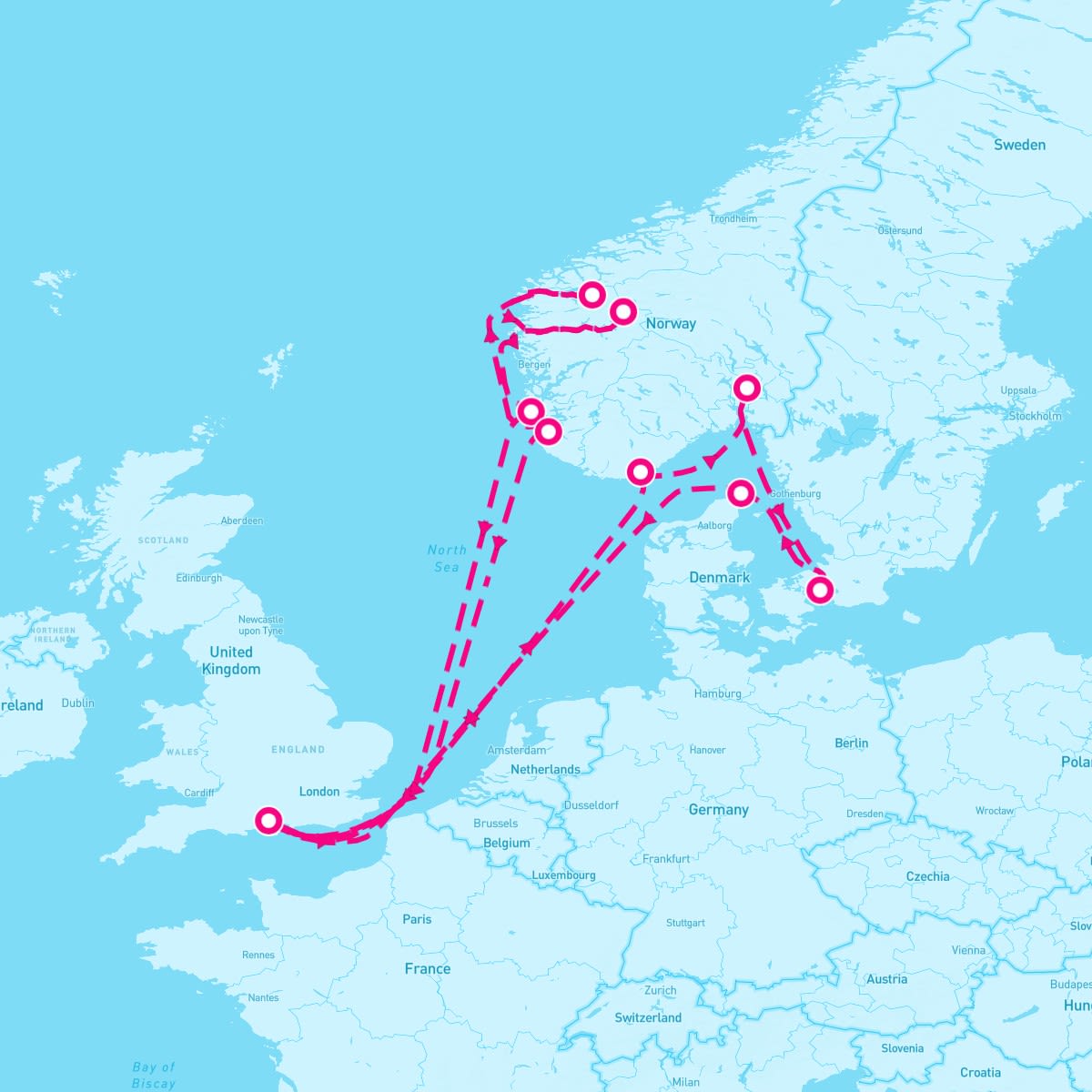 This route includes southampton-england, kristiansand-norway, oslo-norway, copenhagen-denmark, skagen-denmark, haugesund, skjolden-norway, olden-norway, stavanger-norway.