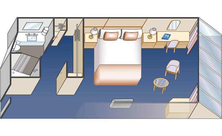 Cabin S105 includes: Stunning slanted floor-to-ceiling windows, Comfortable queen or two twin beds, Refrigerator, Flat-panel television, Private bathroom with shower, 100% cotton and high-thread count linens, 24-hour room service, Spacious closet, Desk with chair, Hair dryer & bathroom amenities, Digital security safe.