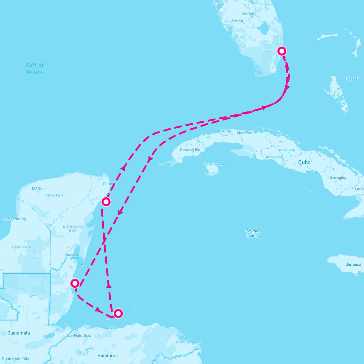 This route includes fort-lauderdale-florida, belize-city-belize, mahogany-bay-honduras, cozumel-mexico.