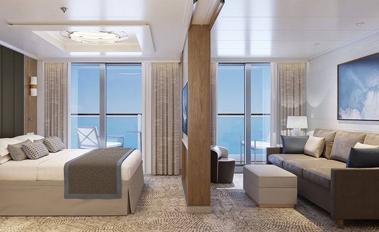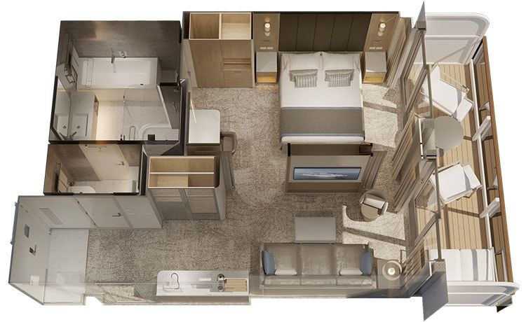 Cabin 15631 includes: Sleeps up to 4 guests, Lavazza Coffee Maker, Separate sitting area with sofa bed and chair with 2 tables, Sanctuary benefits including exclusive dining and events and entertainment, Full bathroom with tub and separate shower, Priority services at check-in & debarkation & tender boarding, One complimentary mini-bar setup and free daily bottled water, 24-hour room service.