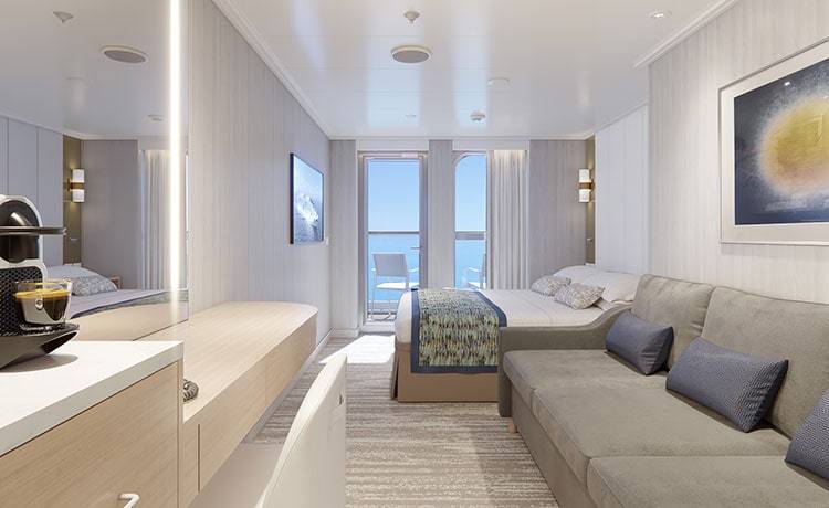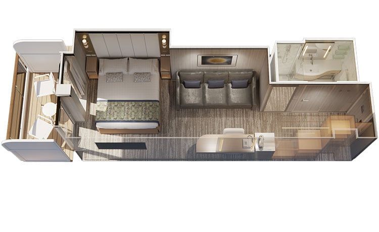 Cabin 6303 includes: Sleeps up to 4 guests, Spacious closet, Desk with chair, Private bathroom with shower, Balcony with 2 chairs and table, Hair dryer & bathroom amenities, Floor-to-ceiling sliding glass doors, Refrigerator, Queen or pair of twin beds, 24-hour room service, 100% cotton and high-thread count linens, Digital security safe, Flat-panel television.