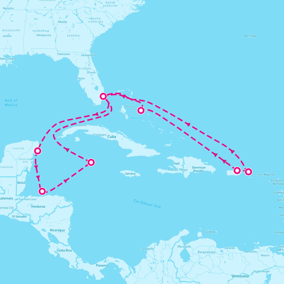 This route includes fort-lauderdale-florida, george-town-grand-cayman, mahogany-bay-honduras, cozumel-mexico, princess-cays-cruise-line-private-island, san-juan-puerto-rico, charlotte-amalie-st-thomas.