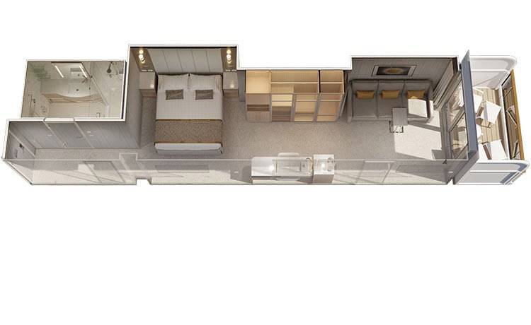 Cabin 16609 includes: Separate seating area with sofa bed and chair with 2 tables, Two flat-panel televisions, Desk with chair, Spacious closet, Luxury balcony furniture, Private bathroom with tub and separate shower‡, Private cabana beside your balcony for an extra-large outdoor lounge space, Hair dryer & bathroom amenities, 2 floor-to-ceiling sliding glass doors, Refrigerator, Queen or pair of twin beds, 24-hour room service, Luxury mattress topper and pillows, Complimentary laundry and professional cleaning services, 100% cotton and high-thread count linens, Complimentary dinner at specialty restaurant on embarkation evening.
