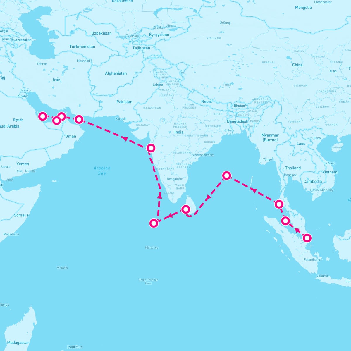 Gulf of Oman, no docking; ships sail between UAE and Oman. Travelers spot dugongs. Excursions to Muscat’s Sultan Qaboos Mosque. Local markets sell dates. Peak season November to March; taxis 5-10 OMR. Dining includes machboos at harbor cafes. Souvenirs feature khanjars. The gulf’s clear waters and desert coasts link Arabian ports with dolphin sightings.
