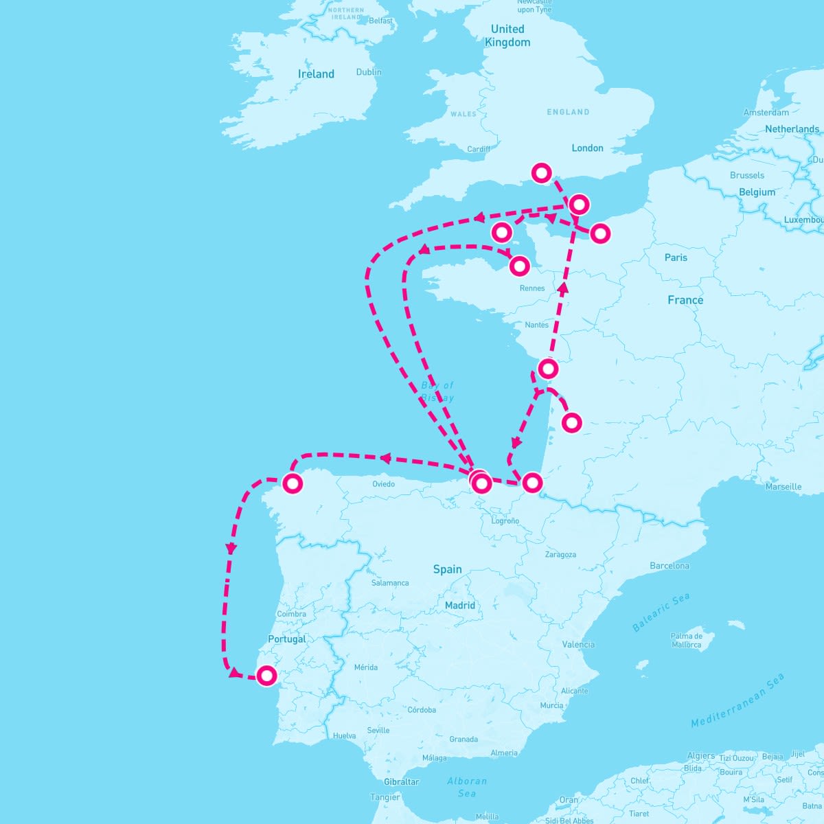 Cruise Bay Of Biscay, no docking; ships sail along French/Spanish coast. Travelers spot dolphins. Lectures cover maritime history. No facilities; provisions from ship. Peak season May to September; weather unpredictable. Photography captures coastal cliffs. Dining limited to ship. Souvenirs include nautical charts.