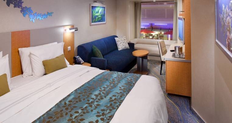 Cabin 7279 is a inside stateroom on Deck 7 of the Adventure of the Seas, a Royal Caribbean Cruise Line ship containing a total of 1671 cabins. Located on the mid-forward, starboard side of the ship, this cabin accommodates up to 2 guests and offers 167 square feet of space. Classified as a Promenade View Interior category (code: 2T), the room features one royal king bed (can convert into two twin-size beds).