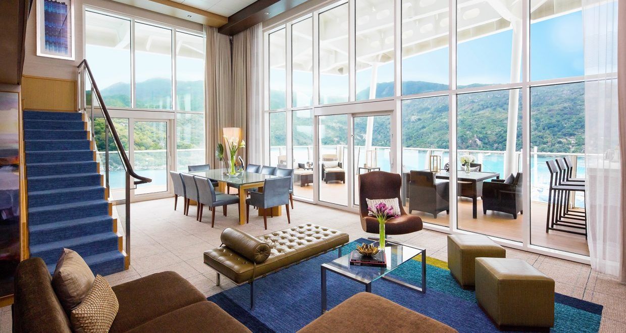 An exquisite and spacious option for larger families, the Royal Loft Suite (category RL) is the epitome of luxury on board Royal Caribbean's cruise ship. With a high-occupancy capacity of up to 6 guests, this suite offers ample space and comfort for everyone to relax and enjoy their vacation. The room is equipped with a separate hideaway bunk area, perfect for children or extra guests. The bed configuration includes one King bed, one Royal King Bed (which can be converted into two twin-size beds), and one double pull out sofa bed, ensuring a comfortable and customizable sleeping arrangement for all. With a room size of 1,524 square feet and a balcony size of 843 square feet, the Royal Loft Suite offers plenty of room for relaxation and entertainment. Treat yourself to the ultimate luxury experience with the Royal Loft Suite.