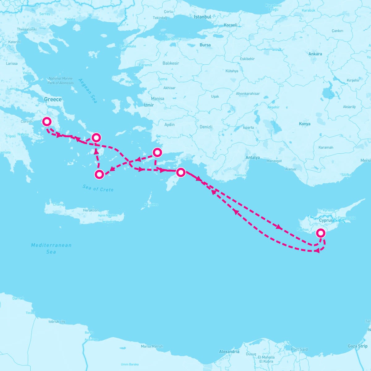 This route includes athens-greece, rhodes-greece, limassol-cyprus, bodrum-turkey, santorini-greece, mykonos-greece.