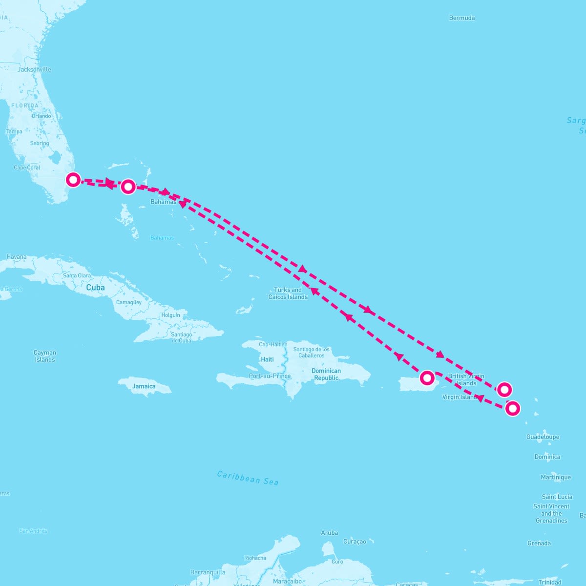 This route includes fort-lauderdale-florida, philipsburg-st-maarten, basseterre-st-kitts, san-juan-puerto-rico, perfect-day-at-coco-cay-bahamas.