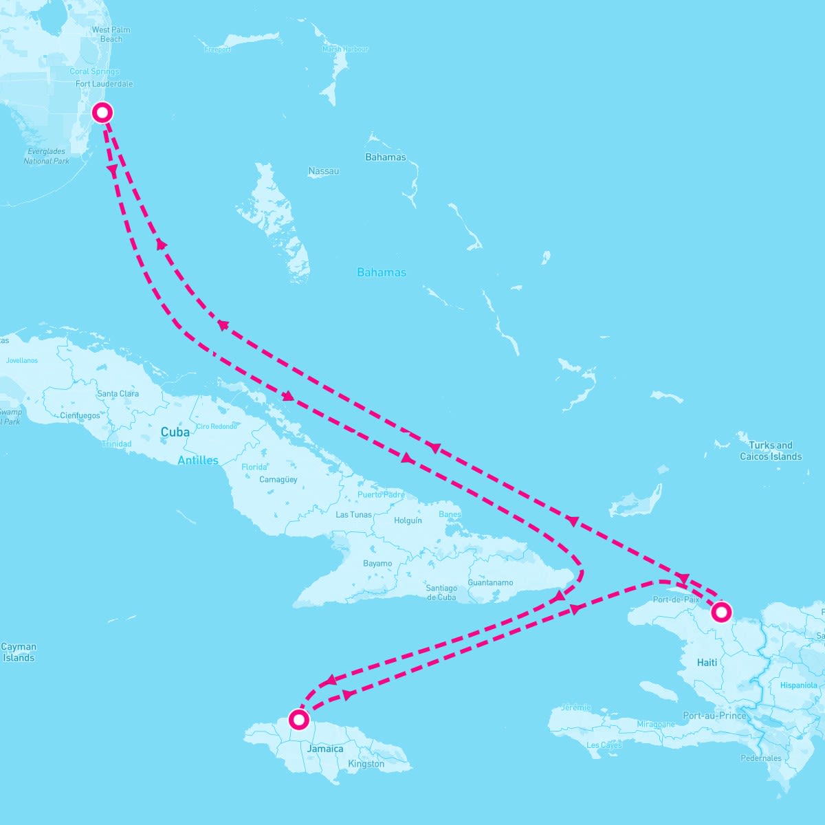 This route includes miami-florida, falmouth-jamaica, labadee-cruiseline-private-island.