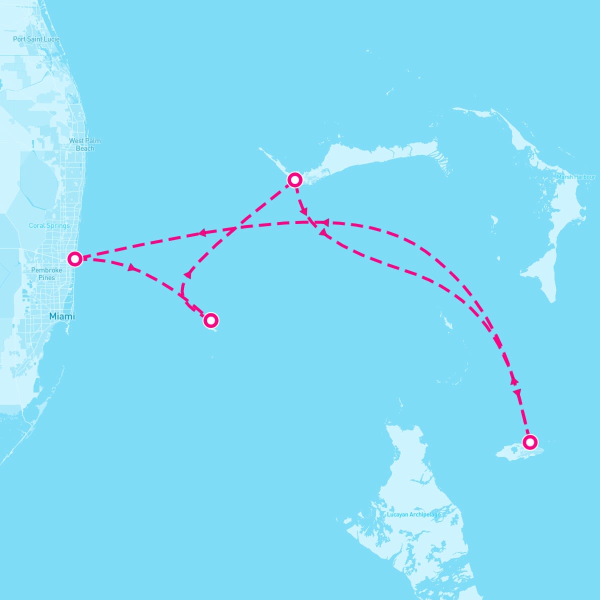 This route includes fort-lauderdale-florida, bimini-bahamas, freeport-bahamas, nassau-bahamas.