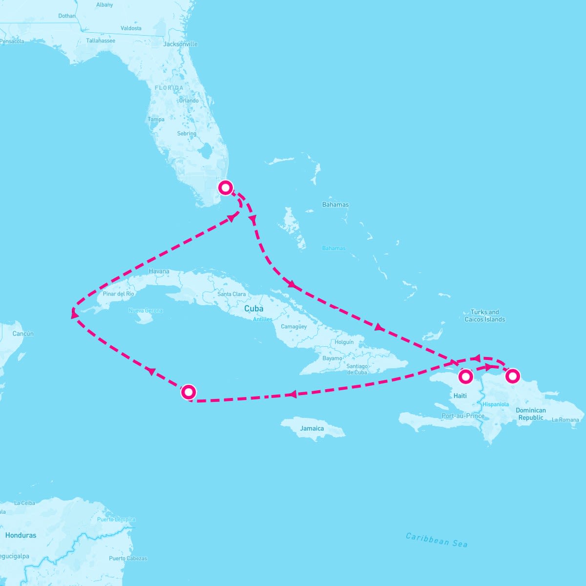 This route includes miami-florida, labadee-cruiseline-private-island, puerto-plata-dominican-republic, george-town-grand-cayman.