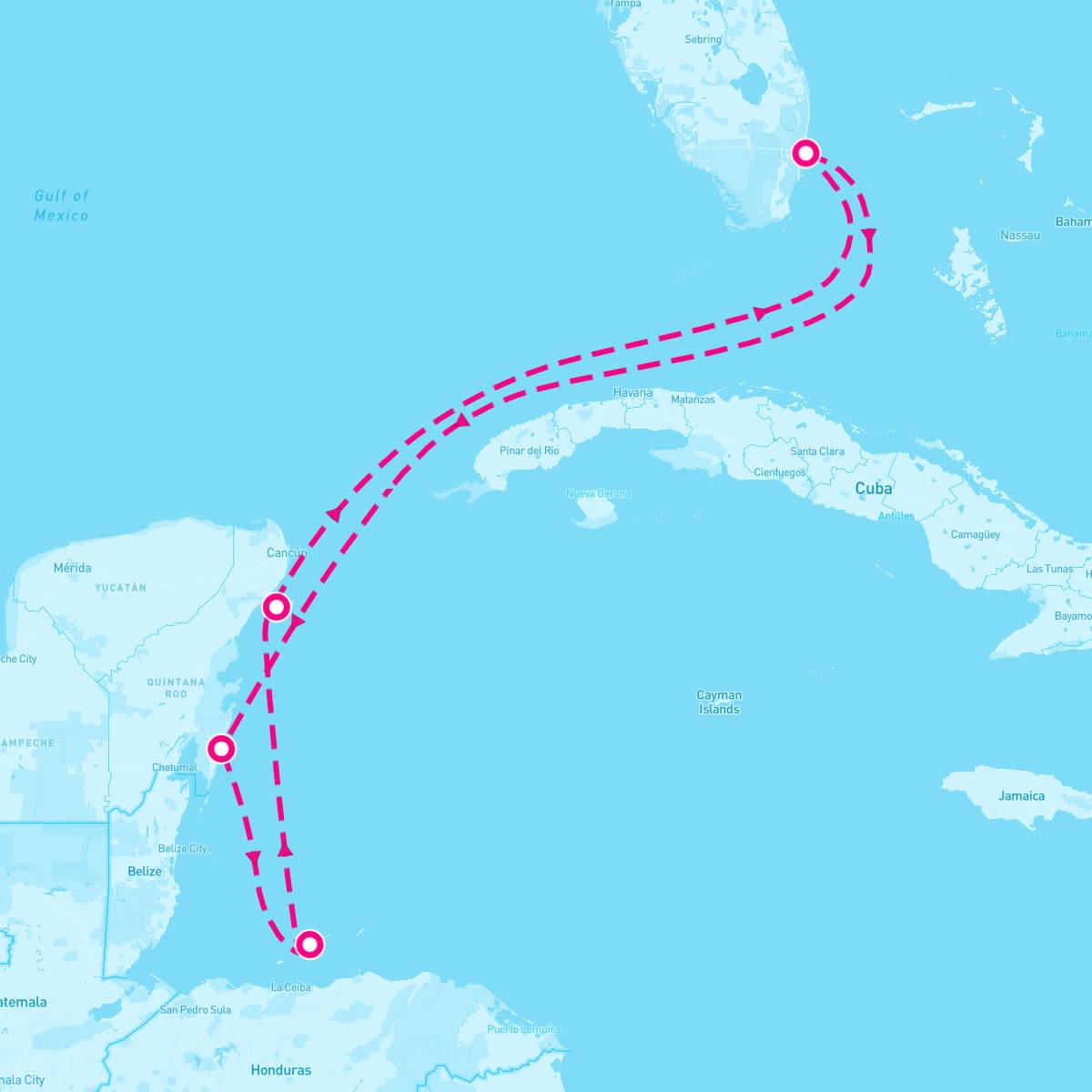 This route includes fort-lauderdale-florida, costa-maya-mexico, roatan-bay-honduras, cozumel-mexico.