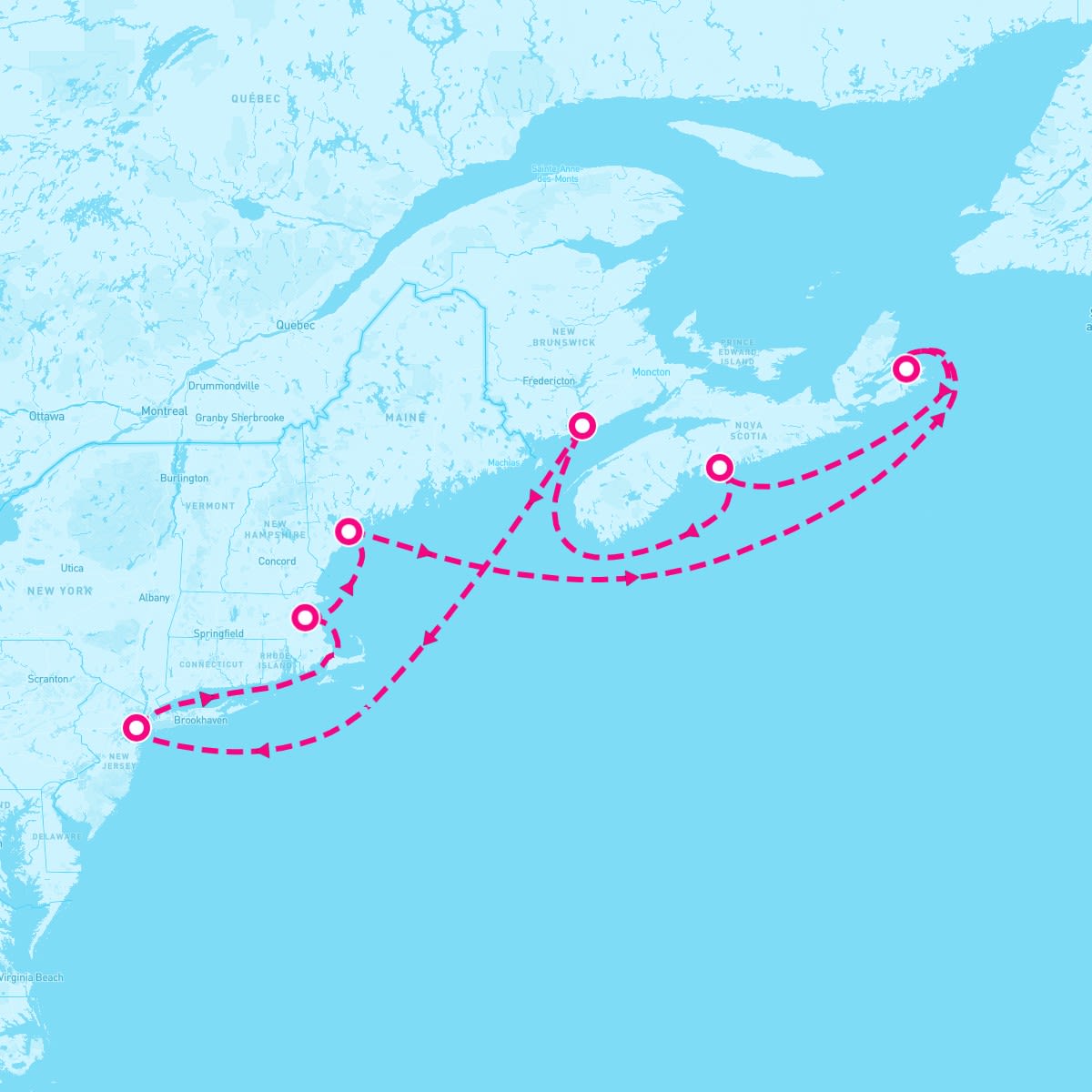 This route includes cape-liberty-bayonne-new-jersey, boston-massachusetts, portland-maine, sydney-nova-scotia, halifax-nova-scotia, st-john-new-brunswick.