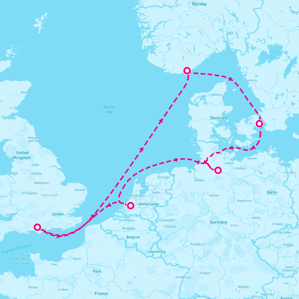 This route includes southampton-england, kristiansand-norway, copenhagen-denmark, hamburg-germany, rotterdam-netherlands.