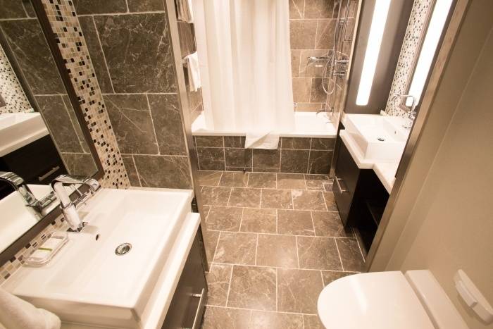 - Ample space including a living room and full bathroom with a tub