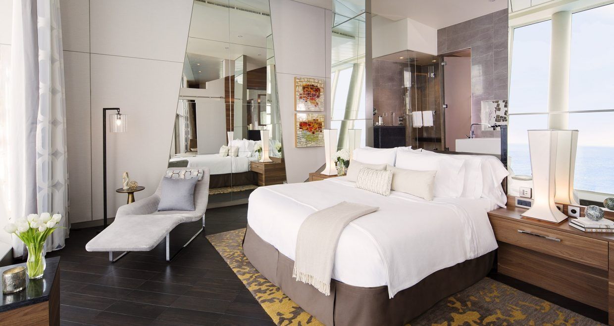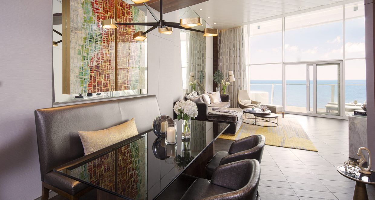 The Royal Suite - 1 Bedroom (RS) is a stunning and spacious suite designed for up to 4 guests. With a total area of 1,260 square feet, this suite is the epitome of luxury on a cruise ship. The suite boasts panoramic views from its large balcony, perfect for taking in the beautiful ocean scenery. Inside, guests will find a grand living area complete with a baby grand piano, inviting them to relax and feel like royalty. The bed configuration includes one king bed and one double pull out sofa bed, providing comfortable accommodations for all. Step out onto the 224 square foot balcony and feel the ocean breeze in this extraordinary suite.