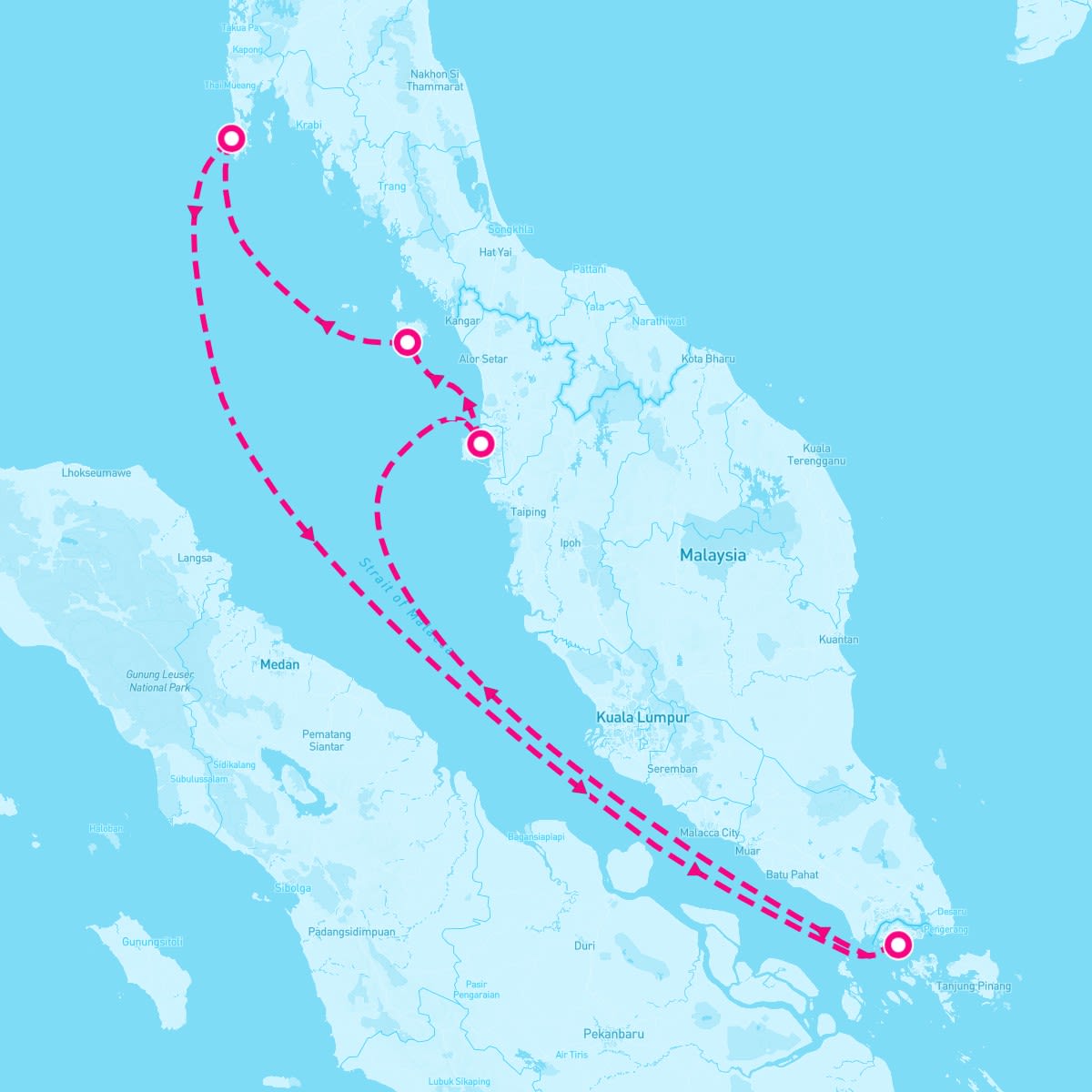 This route includes singapore, pulau-malaysia, langkawi-malaysia, phuket-thailand.